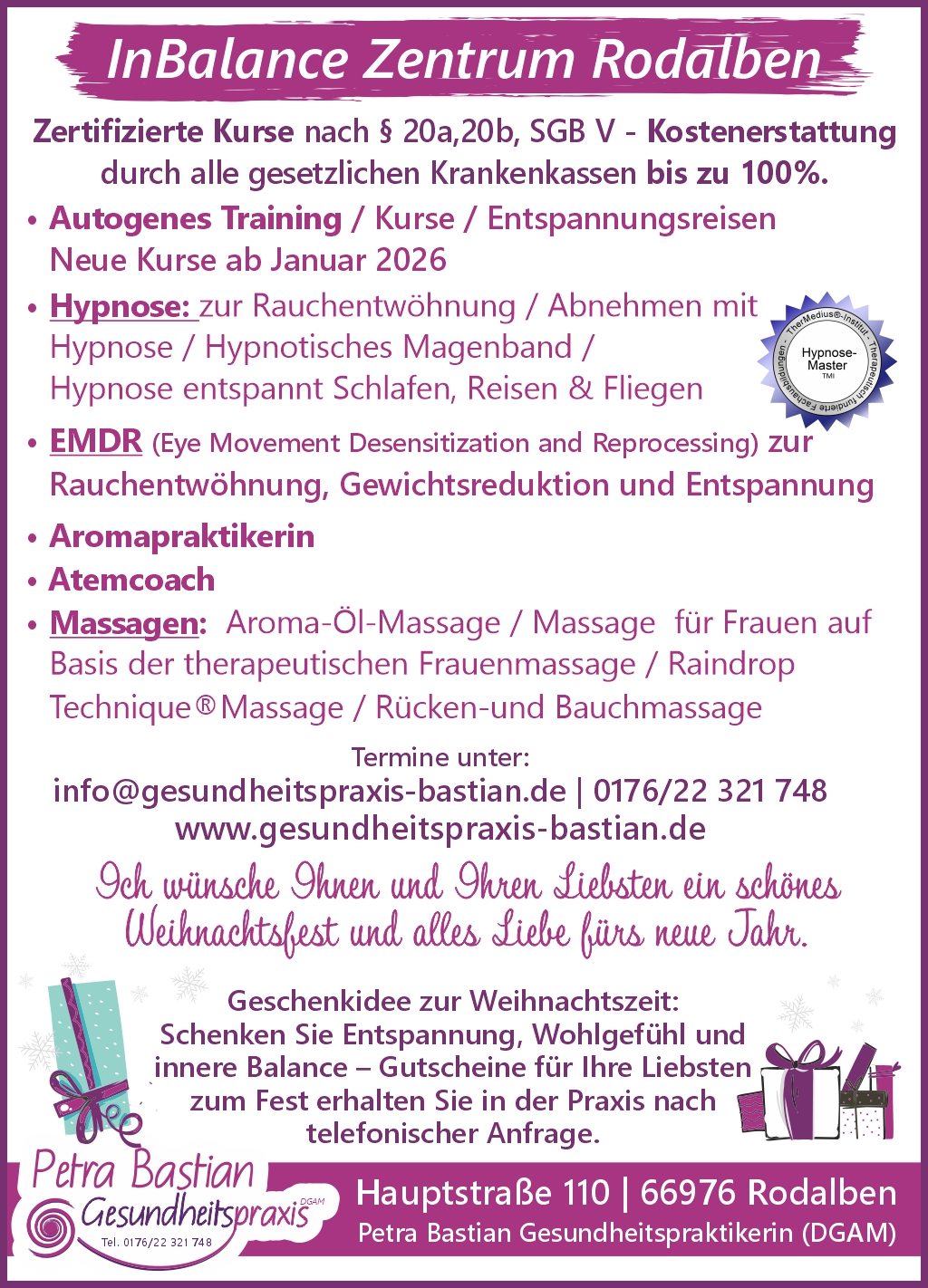 Ich bin Petra Bastian, Deine Gesundheitspraktikerin, und ich freue mich, dich auf meiner Webseite begrüßen zu dürfen. Mein Ziel ist es, dir auf deinem Weg zu mehr Wohlbefinden und Lebensqualität zur Seite zu stehen.